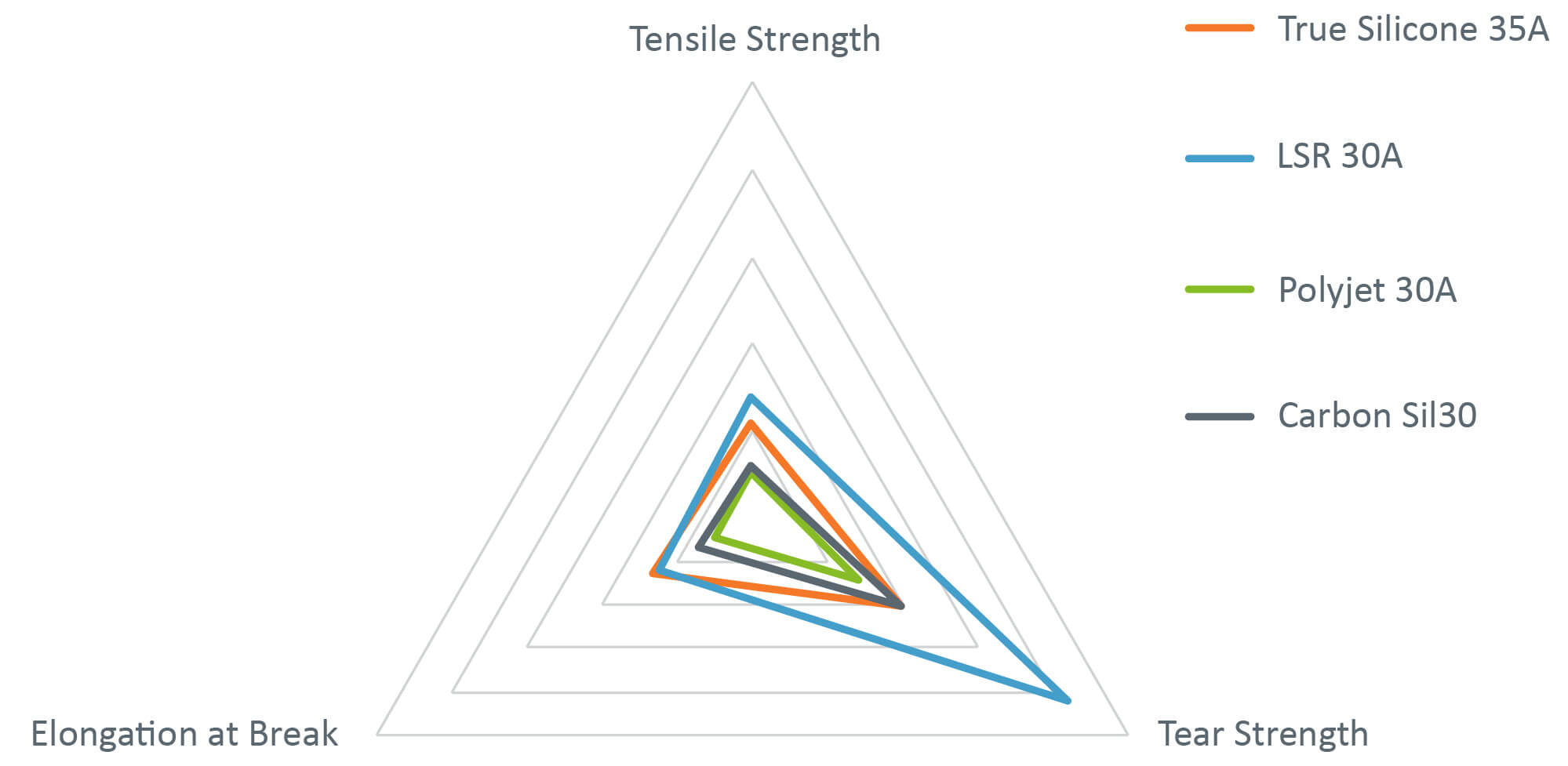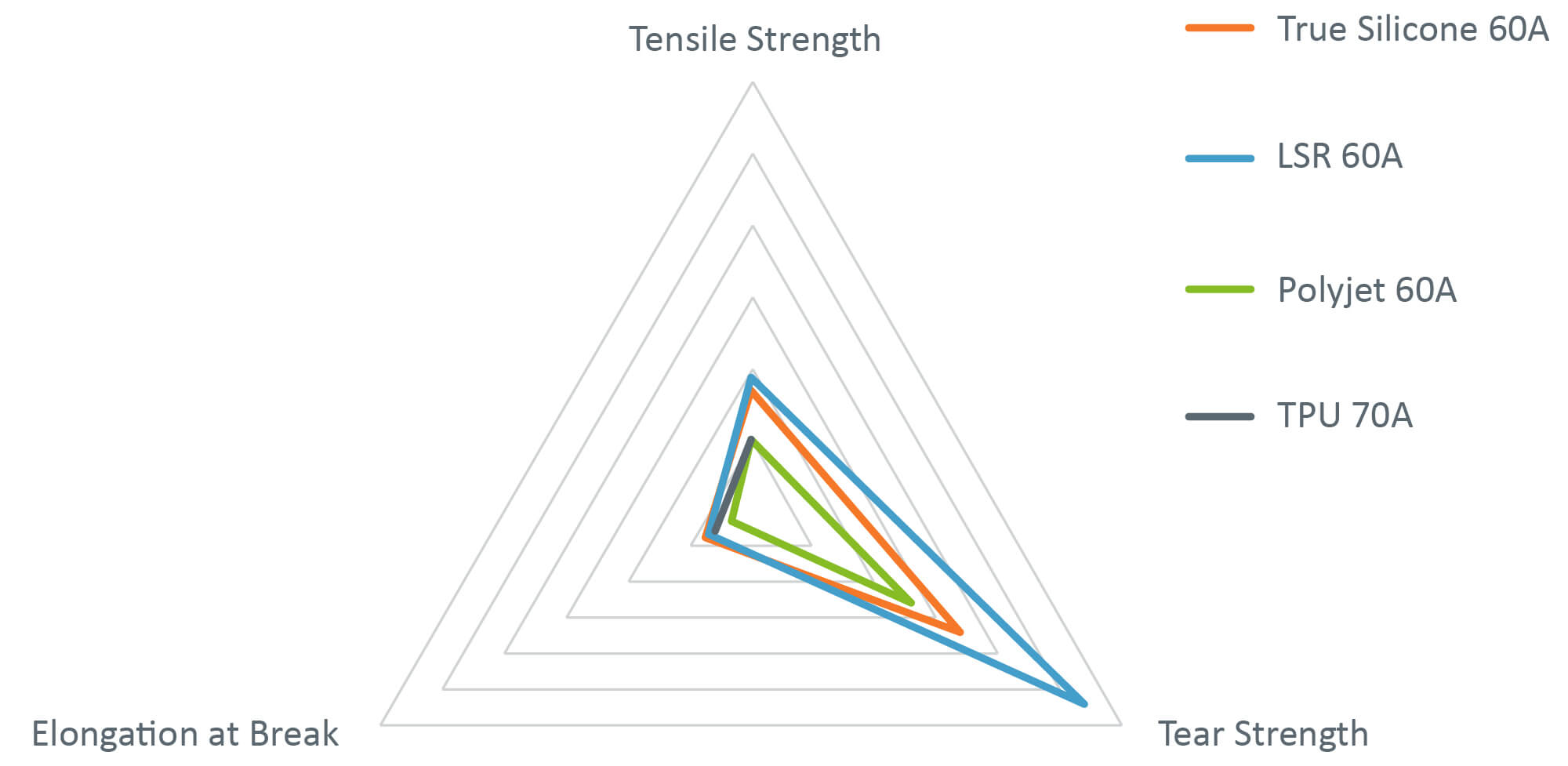 Choose from multiple 3D printing elastomeric materials that range in shore A hardnesses from 20A to 95A