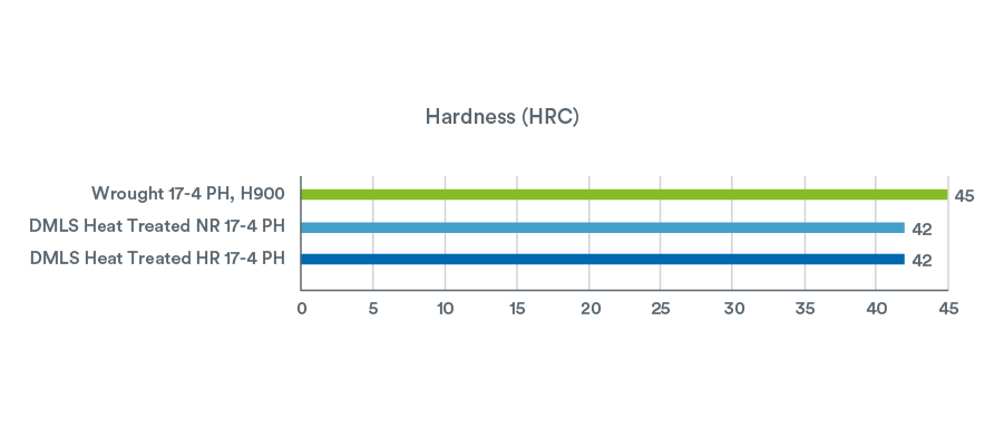 | DMLS HR 17-4 PH | Heat Treated | 199 ksi | 10% | 42 HRC |