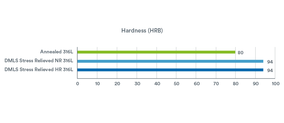 | DMLS HR 316L | Stress Relieved | 89 ksi | 55% | 94 HRB |