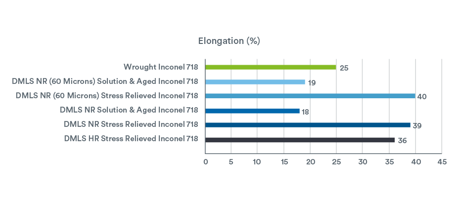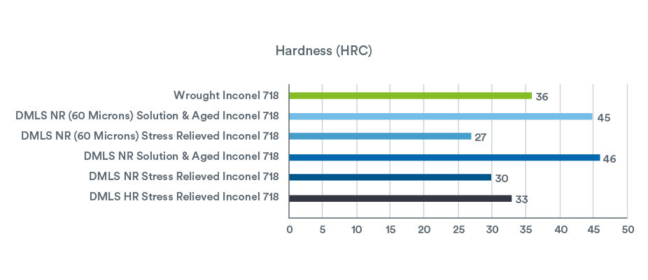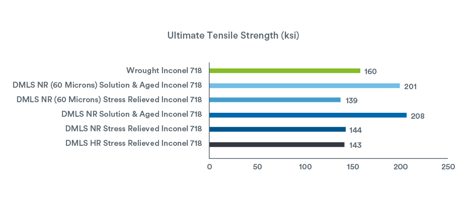| DMLS NR (60 Microns) Inconel 718 | Stress Relieved | 139 ksi | 27 HRC | 40% |