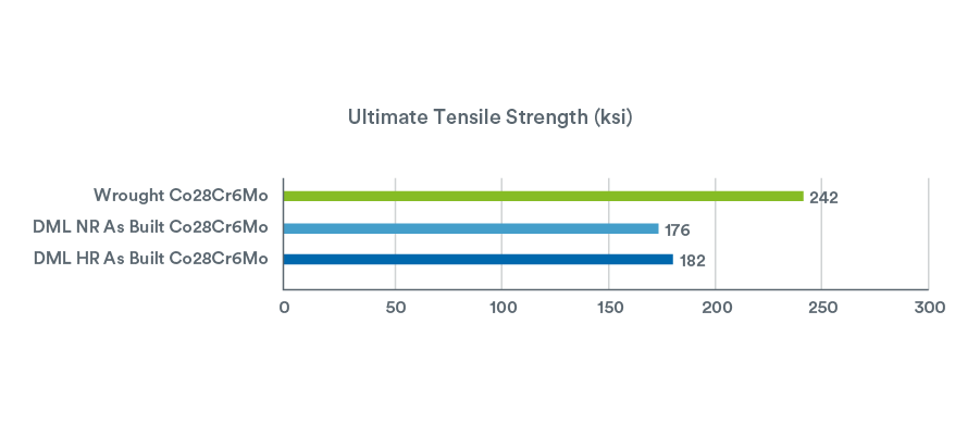| DMLS HR Co28Cr6Mo | As Built | 182 ksi | 39 HRC | 17% |