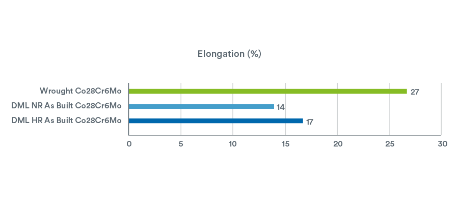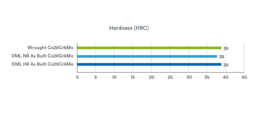 Cobalt chrome (Co28Cr6Mo) is another DMLS superalloy that is used for specialty applications within the aerospace and medical industries because of its strength-to-weight ratio, creep, and corrosion resistance properties. DMLS Co28Cr6Mo, as defined by ASTM F75, hardness values are in line with wrought Co28Cr6Mo, but ultimate tensile strength and elongation are not as closely aligned.