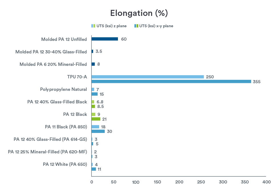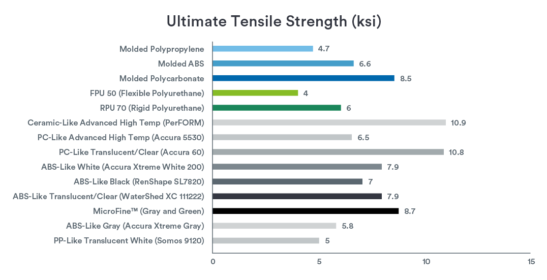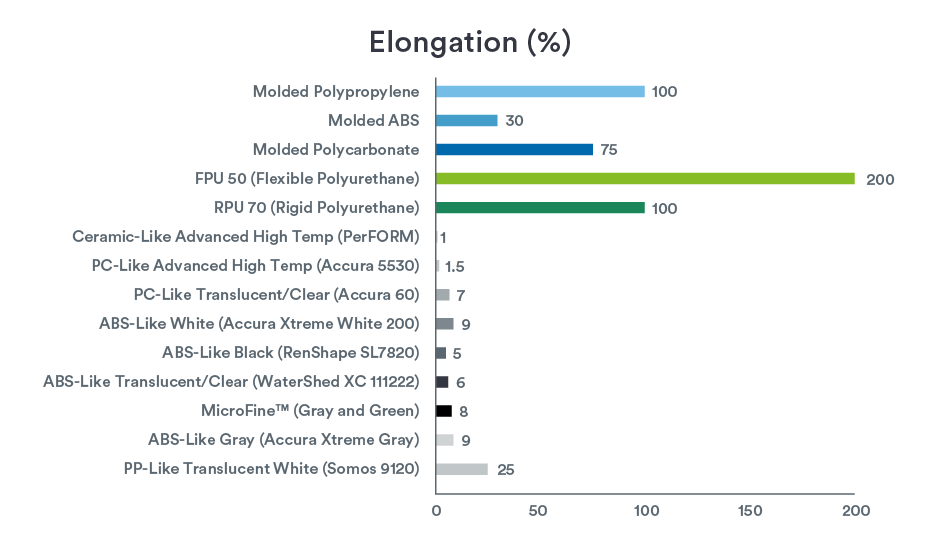 Since 3D printing is unique, a goal of finding a perfect match to a cast, molded, or machined material is ill-advised. Within this guide, you’ll see some charted comparisons to traditional manufacturing methods that are intended to help level set AM material expectations for certain mechanical or physical properties.
