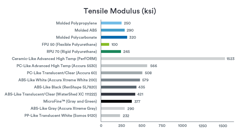 | PC-Like Advanced High Temp (Accura 5530) | 6.5 ksi | 1.5% | 566 ksi | 410o F |