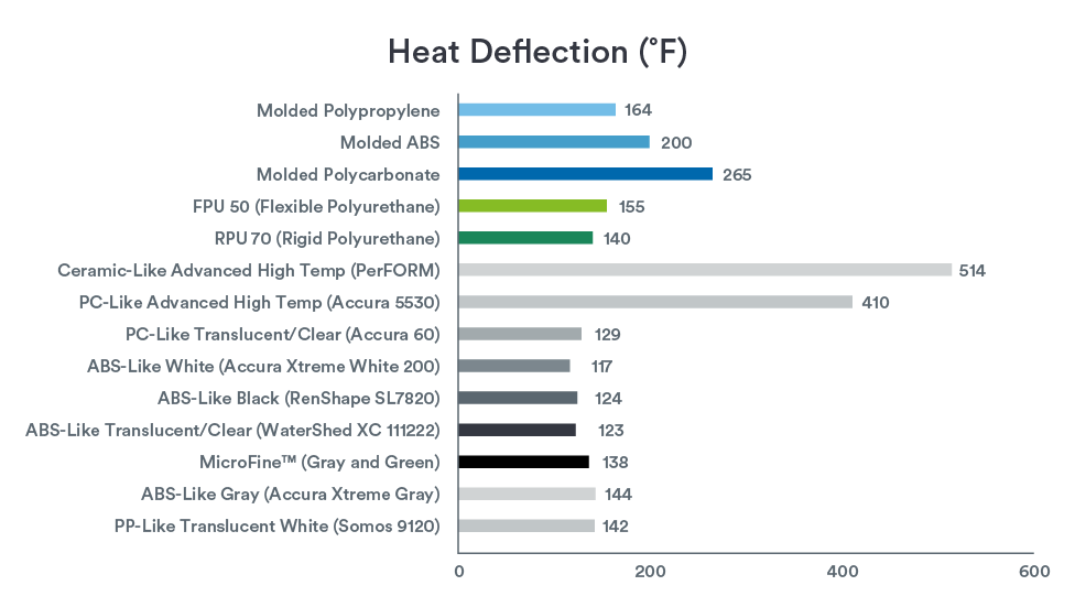 Ceramic-like Advanced HighTemp (PerFORM) exhibits the highest tensile strength and tensile modulus making it the stiffest performance material of the SLA materials. When the thermal cure option is applied to parts made from PerFORM, it exhibits the highest HDT as high as 514 degrees F (measured at 66 psi) of the SLA materials and superior HDT when compared to similar injection-molded materials.
