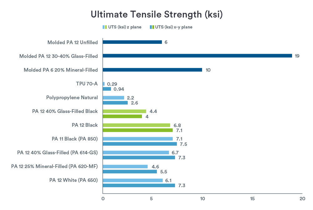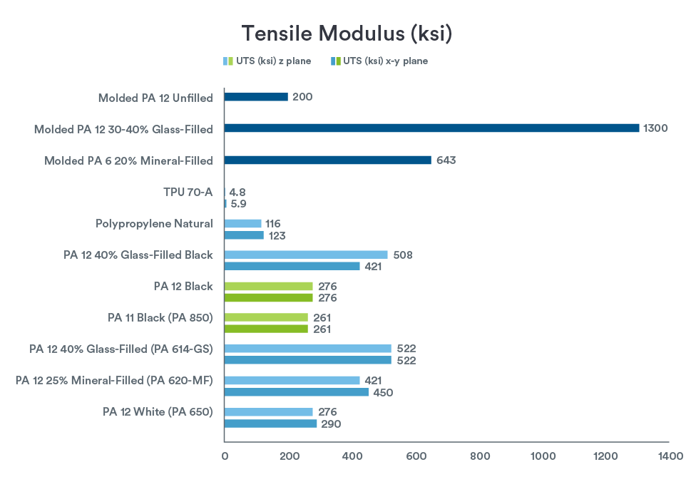 | PA 12 40% Glass-Filled (PA 614-GS) | X-Y Plane | 6.7 ksi | 3% | 522 ksi | 315o F |