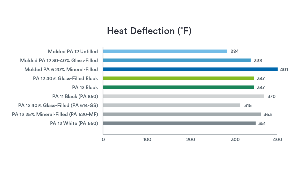 Generally, PAs, when compared to the average values of their injection-molded counterparts, have similar HDT values butlower mechanical properties. SLS/MJF material properties have a known degree of anisotropism when measured in the x-y plane or the z plane. Values reported in this guide account for both measurements.
