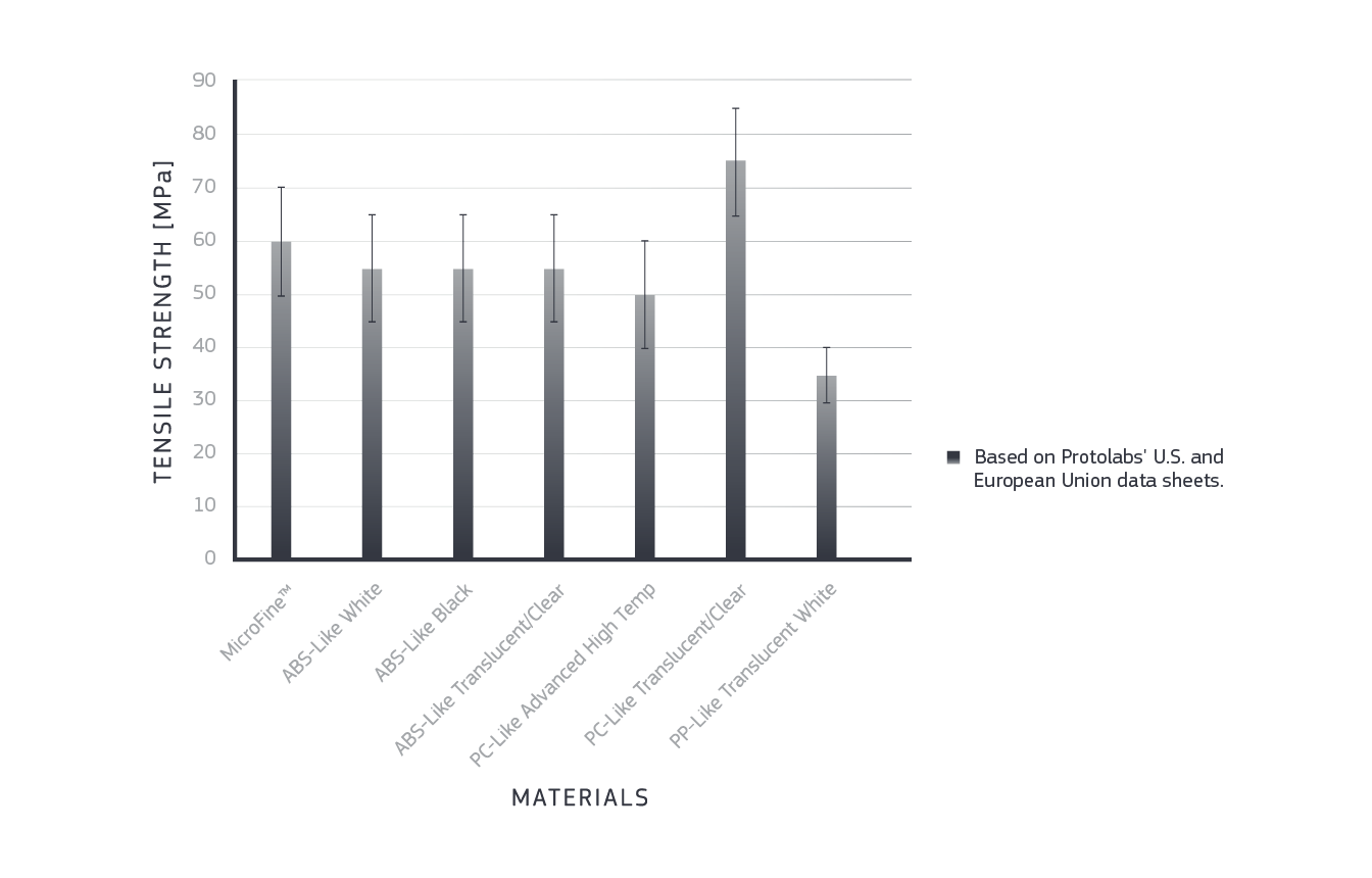 SLA is a plastic 3D printing process that uses a thermoset liquid, not a thermoplastic, which is UV-cured in layers to form final parts. Because of this major difference in fabrication methods, material properties like tensile strength, heat deflection, and flexural modulus may differ from SLA’s more traditional counterpart. Furthermore, SLA produces anisotropic properties where the values for X, Y, and Z axes may differ depending on the orientation of the build—a consideration unique to 3D printing processes.