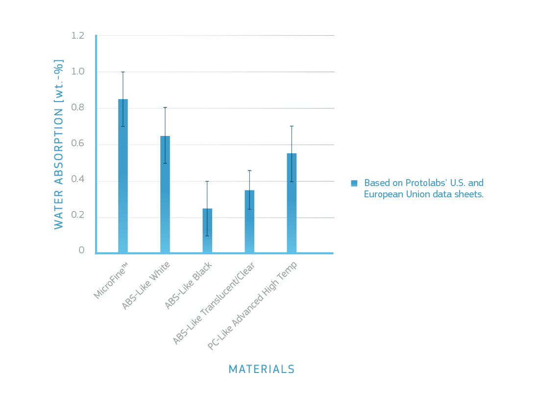 The charts below measure several thermoplastic-like materials suitable for SLA printing against various material properties: Tensile strength, elongation at break, water absorption, and e-modulus.